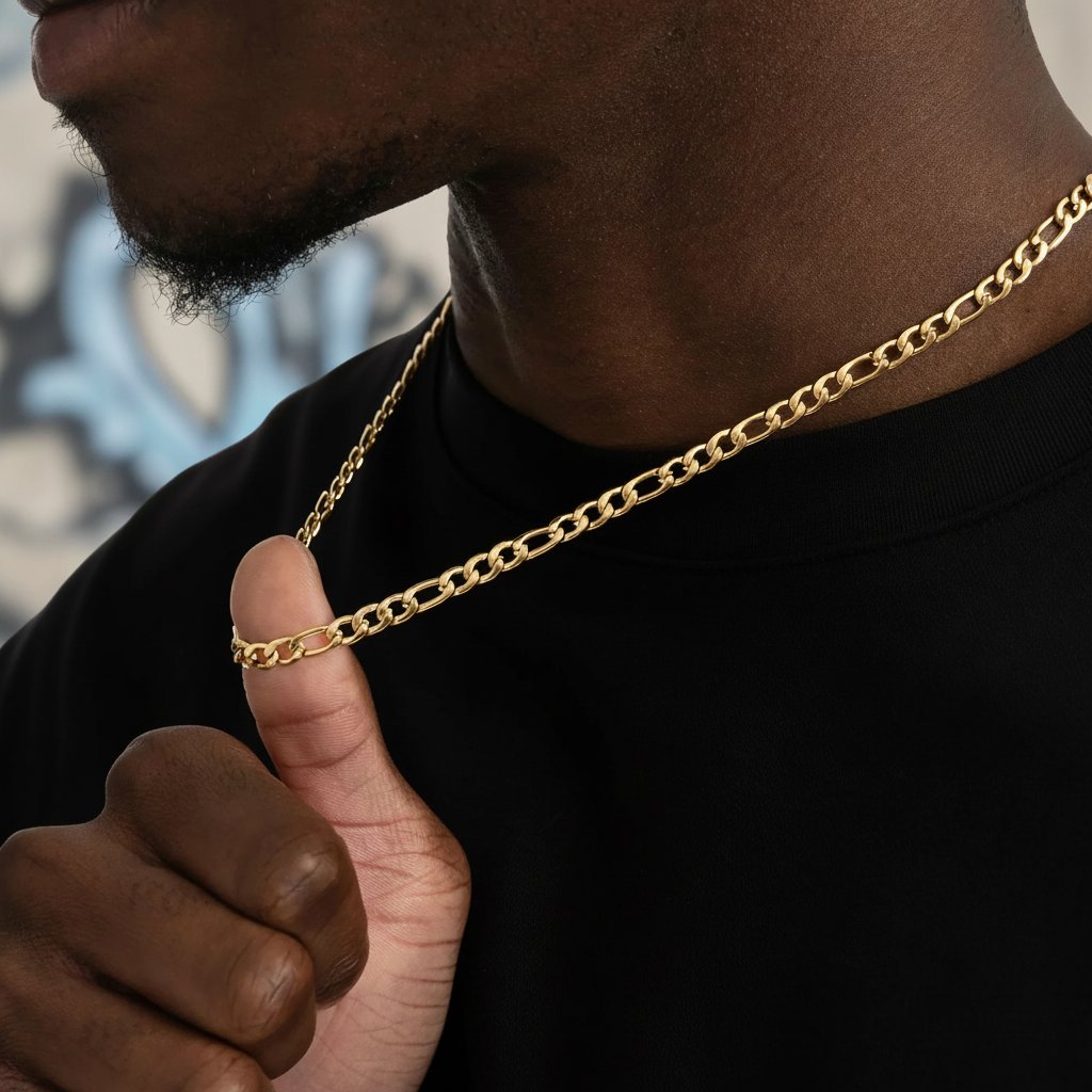 5mm Figaro chain, crafted from high-quality, hypoallergenic stainless steel. Its five-layer plated finish ensures long-lasting shine. Perfect for everyday wear or special occasions.