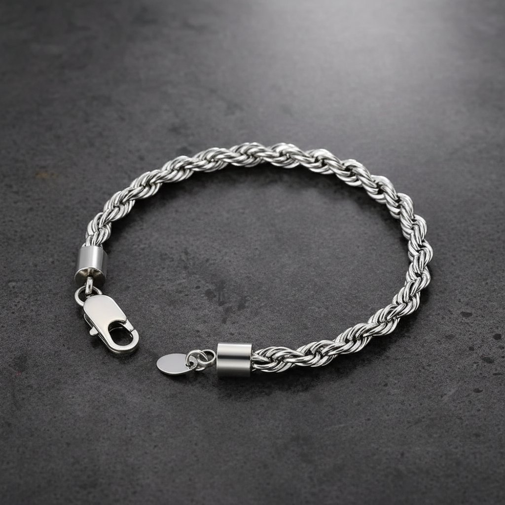 Sleek, stylish, and timeless. This rope bracelet features a silver color finish on durable stainless steel, with a classic twisted design and a clean, polished shine. Perfect for everyday wear or elevating any outfit.