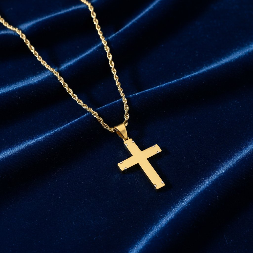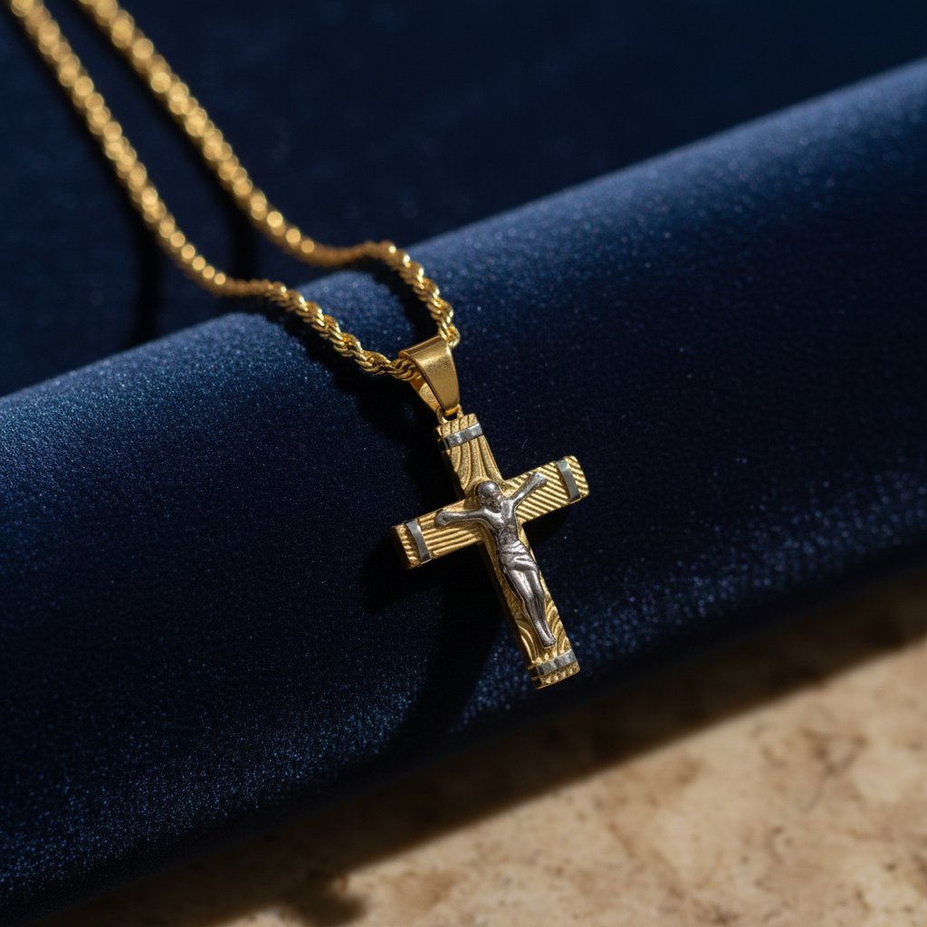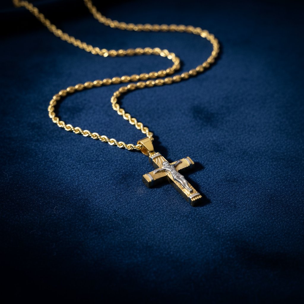 Make a bold statement of faith and style with the Divine Cross Necklace. Featuring a finely crafted two-tone crucifix pendant on a classic rope chain, it blends timeless symbolism with modern elegance. Made from gold-plated stainless steel, it’s durable, tarnish-resistant, and perfect for everyday wear.