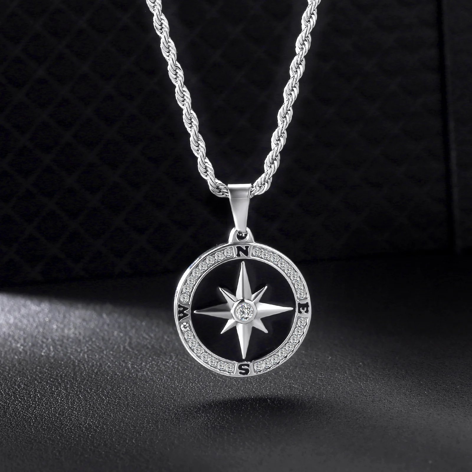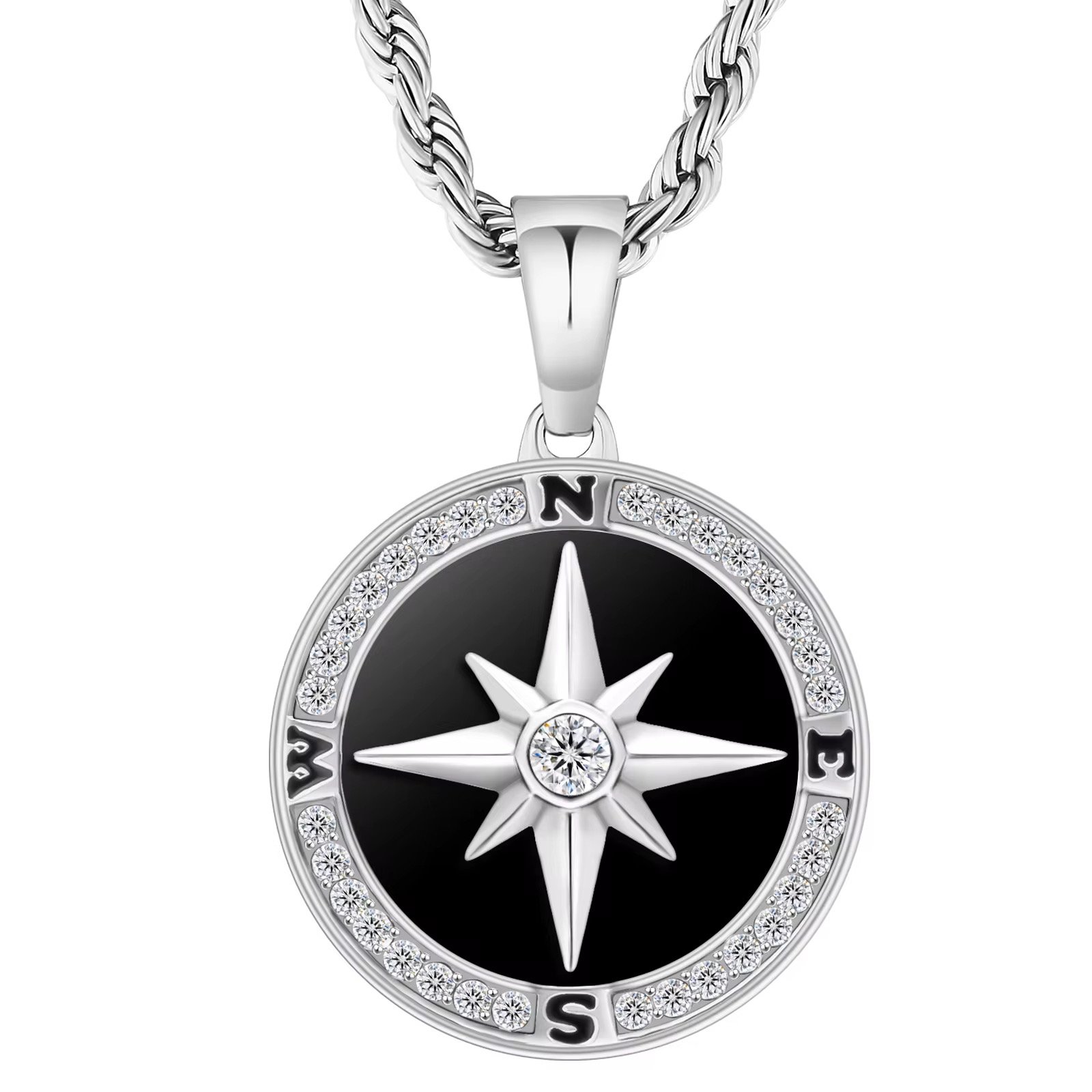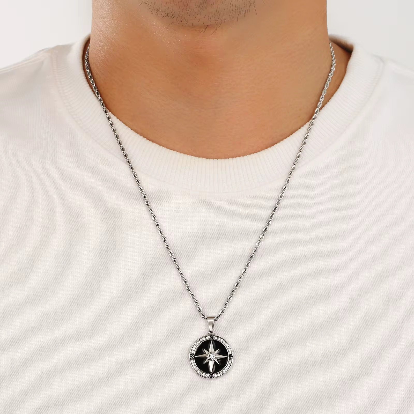 Eternal Compass Necklace with Rope Chain for Men - A stainless steel men’s necklace with a compass pendant symbolizing guidance and luck. Features a small CZ stoneand a 22-inch chain. Tarnish-resistant and made for everyday wear.