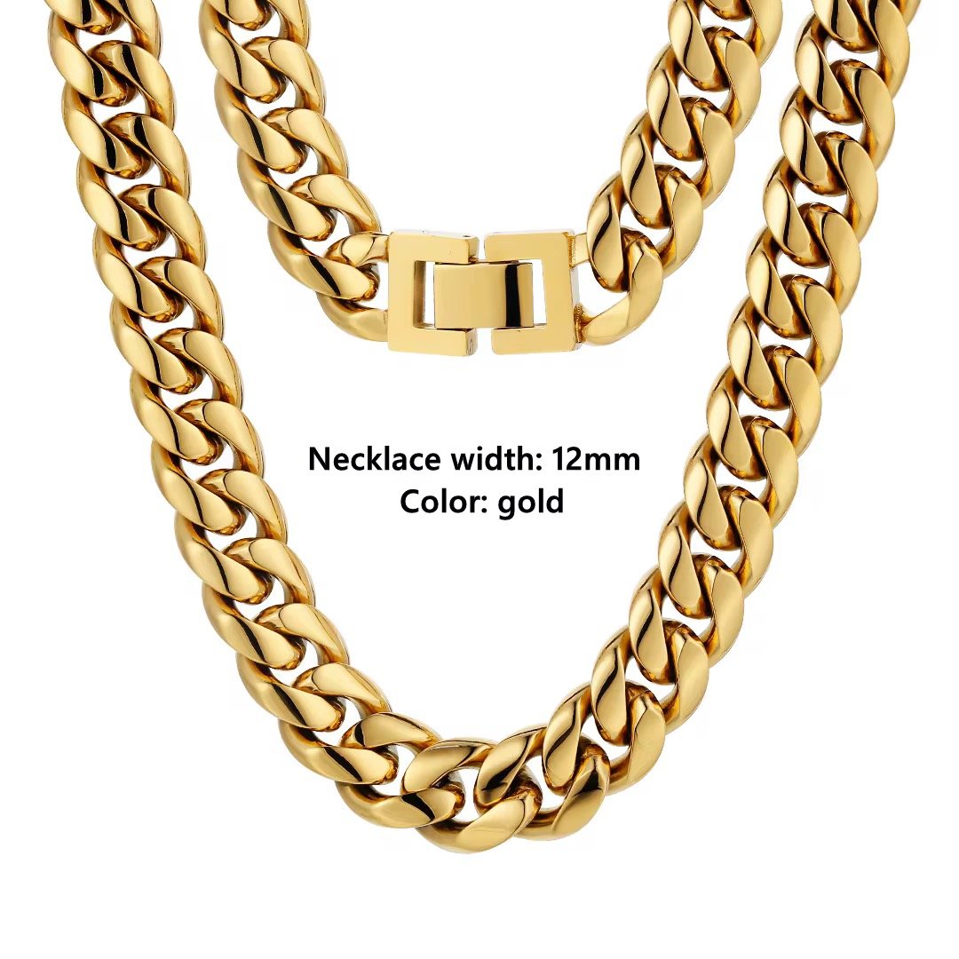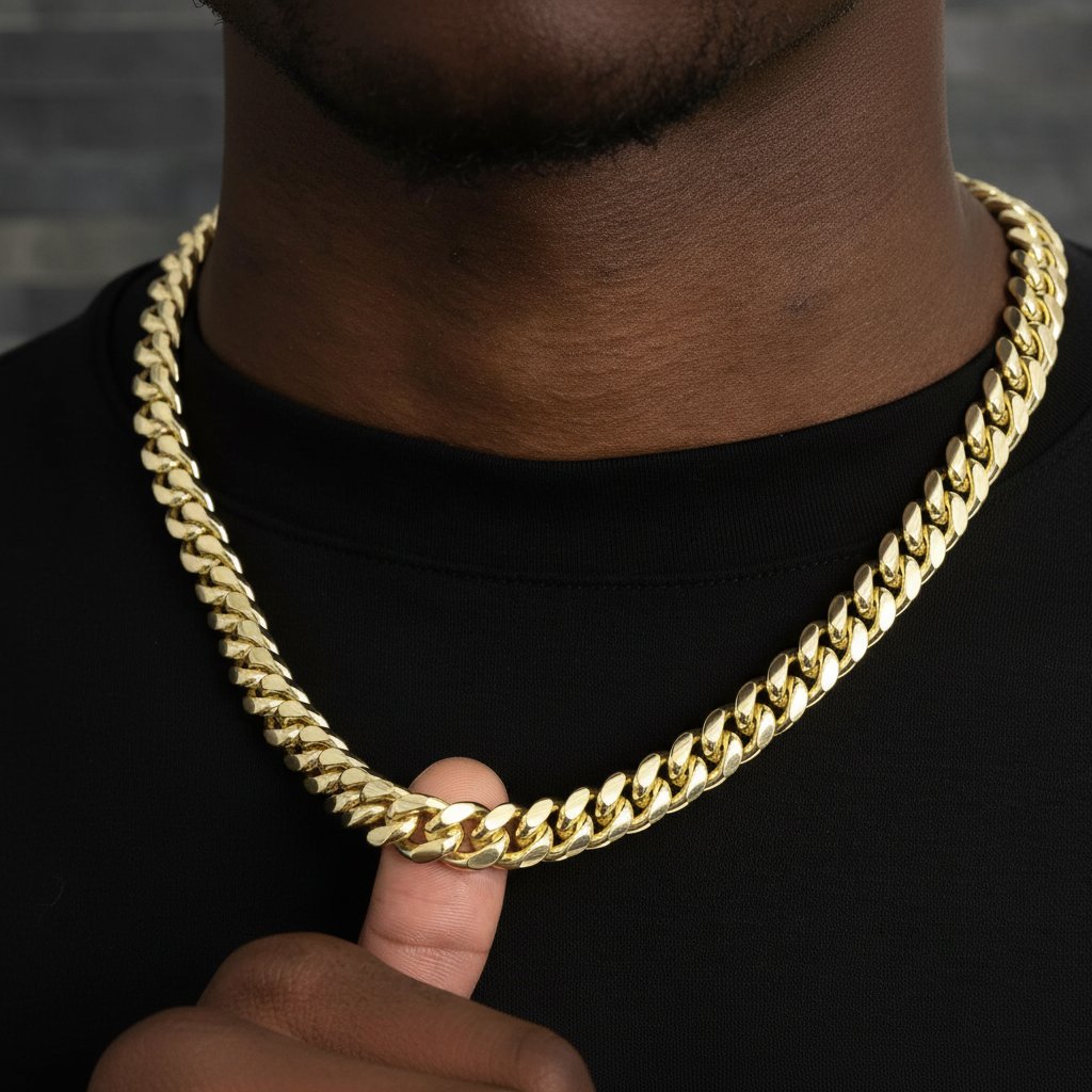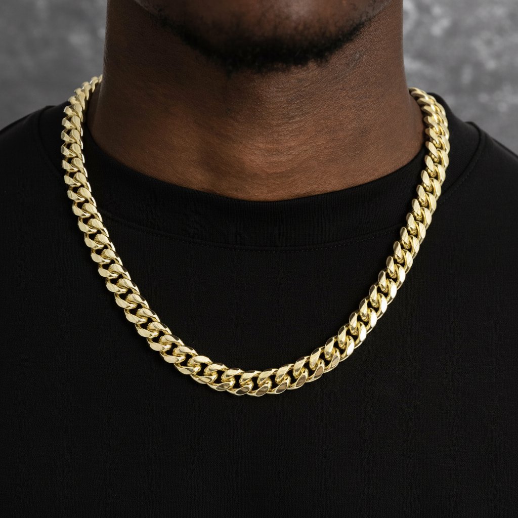 The Gold Drip Chain is a bold 12mm Miami Cuban link necklace crafted from high-quality stainless steel and finished with a five-layer 18K gold plating for long-lasting shine.