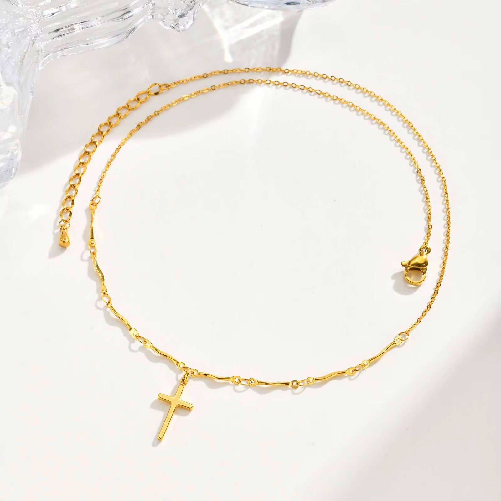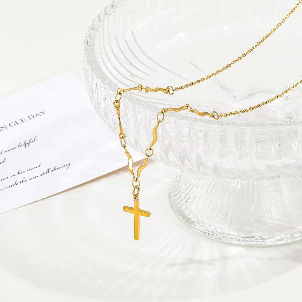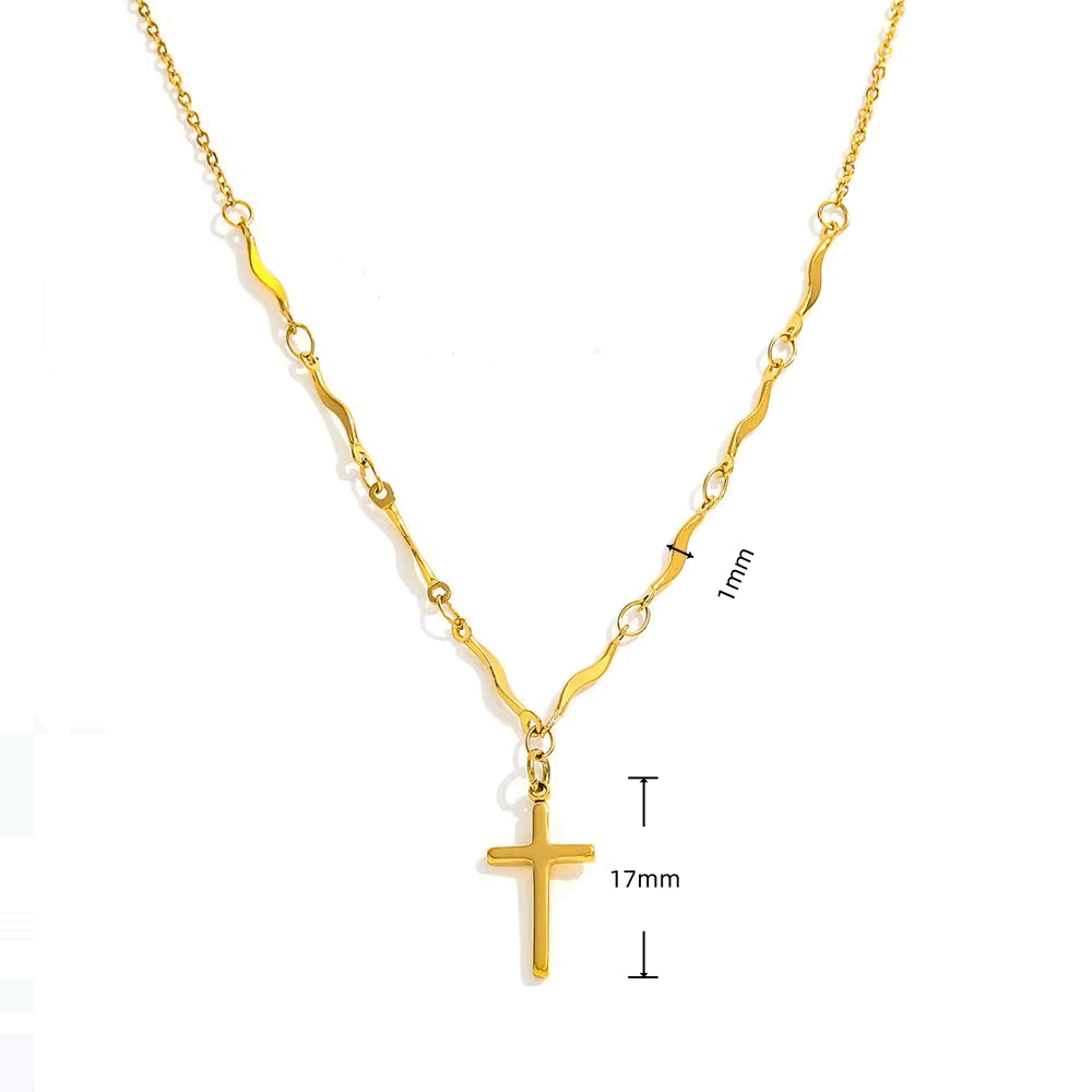 the Golden Faith Cross Necklace. This elegant necklace features a delicate cross pendant crafted from high-quality stainless steel and finished with a beautiful 18K gold plating.