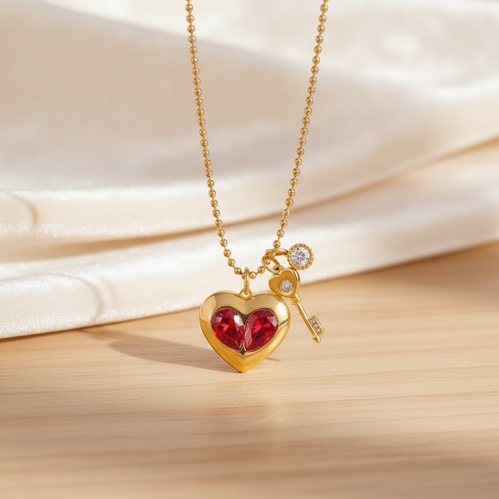 Add a touch of romance and elegance to your look with this stunning red heart necklace. Featuring a beautifully crafted heart-shaped pendant set with a sparkling red zircon stone. Made from high-quality 316L stainless steel with 18K PVD gold plating.